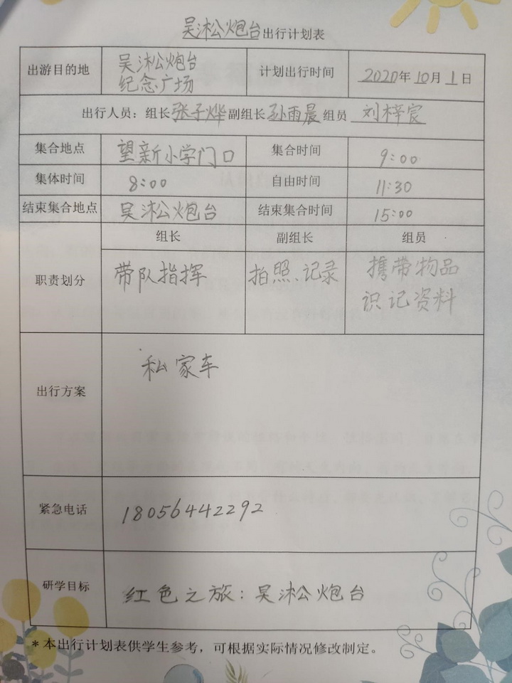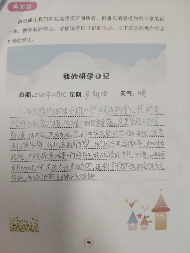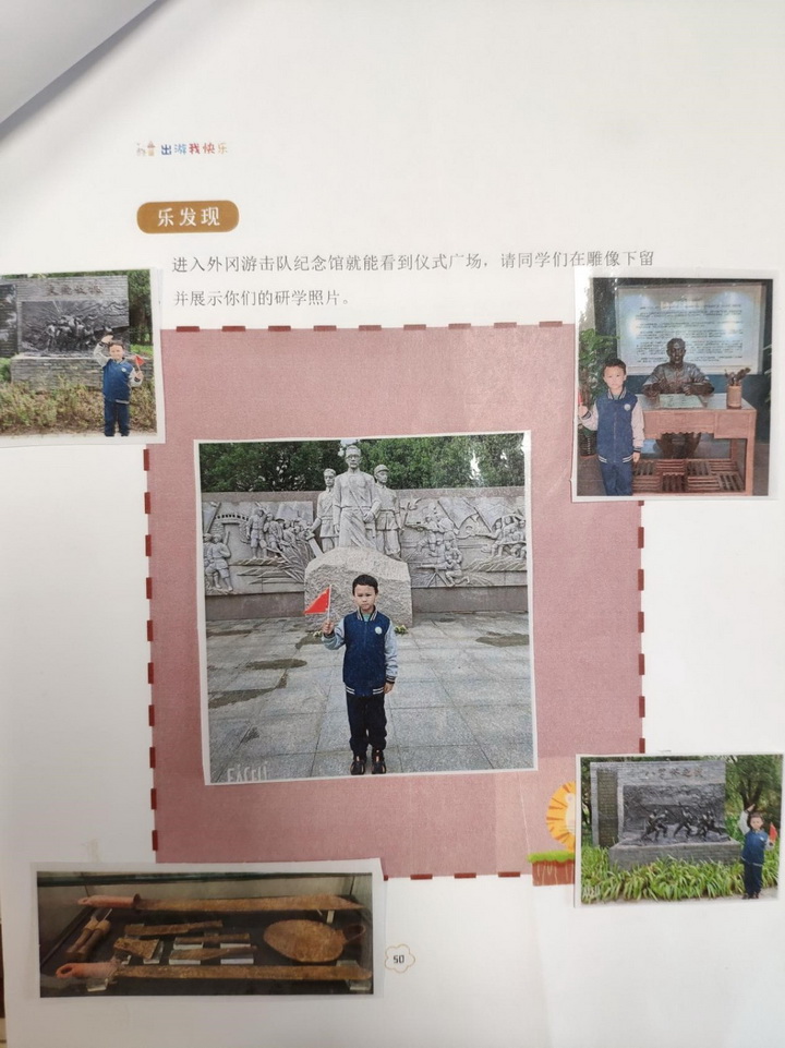 八天小长假结束后,孩子们真可谓是获益匪浅!从外冈游击队纪念馆里的一张张照片中,孩子们仿佛看到了吕炳奎队长带着队员们轰炸日军汽艇的画面;从四行仓库墙面上的弹孔中,孩子们仿佛聆听到了“誓与祖国共存亡”的铮铮誓言······一张张研学照片、一篇篇研学日记、一份份研学计划表见证了孩子们的专注与成长!