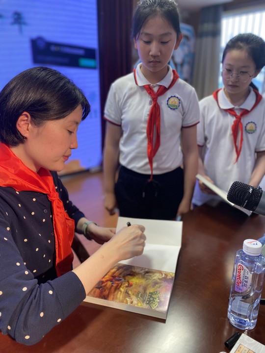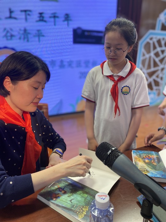 谷清平老师刚一入场,就获得我校师生代表的热烈欢迎。讲座的伊始,谷清平老师用生动有趣地事例讲述了她在创作《汤小团》系列的经历,原来这套书的灵感来源于她和女儿的对话,对话中她了解到女儿对于历史故事不感兴趣,她就想创作一部文学作品让女儿喜欢上历史故事。于是,创作汤小团系列作品时,她以“汤小团”为儿童的主角人物,把儿童文学和历史故事的结合,展开了穿越中国上下五千年历史的奇幻历史故事。《汤小团》系列介绍完后,同学们意犹未尽。于是谷老师又介绍了另外的作品《神龙寻宝队》,这一系列的作品创作以寻宝队寻找文物国宝为故事的主线,讲述了一个个文物的故事。