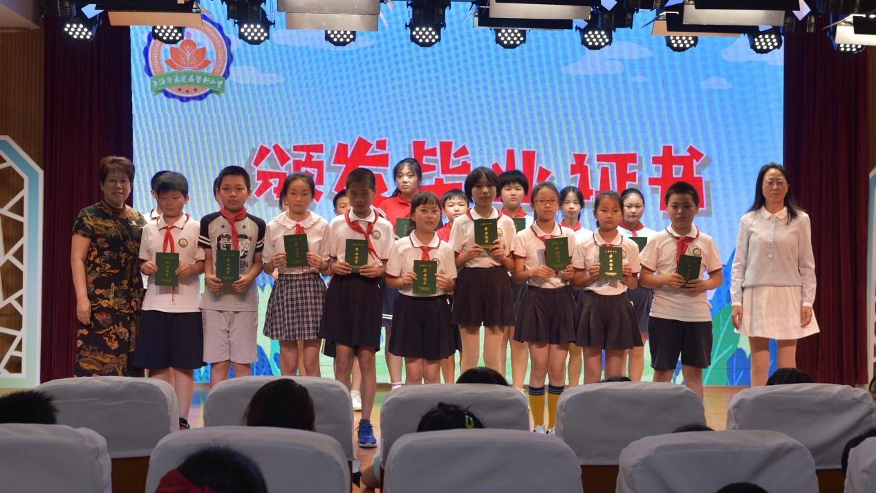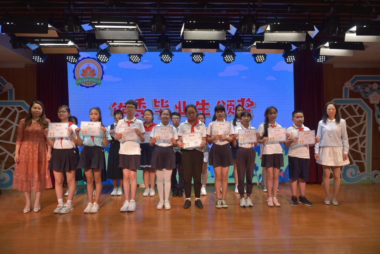 并表彰18位优秀毕业生,为他们颁发“优秀毕业生”荣誉证书。之后校长徐凤娟、副校长张黎莉向学生代表颁发了毕业证书,为孩子们五年快乐成长画上了圆满的句号。